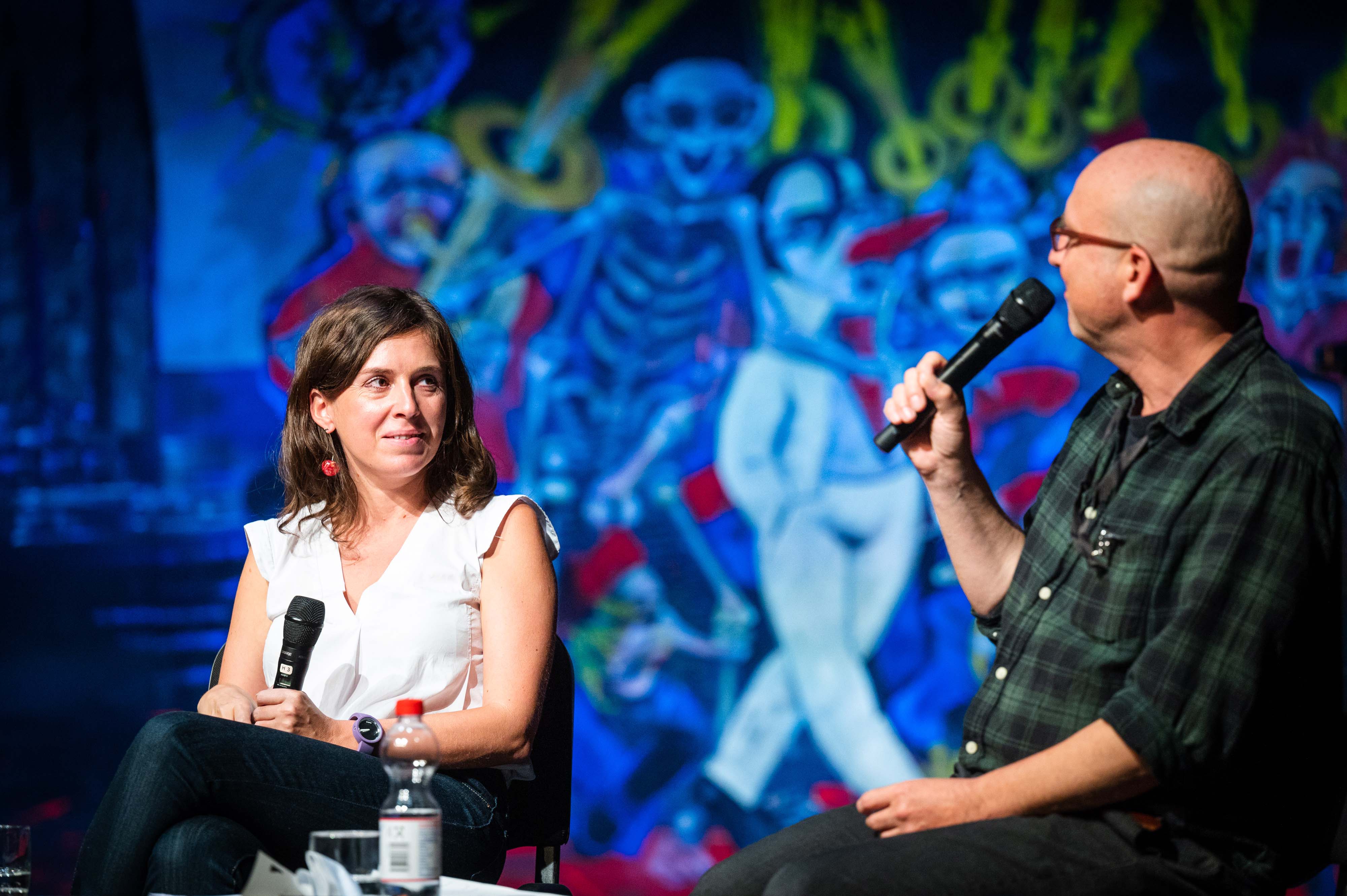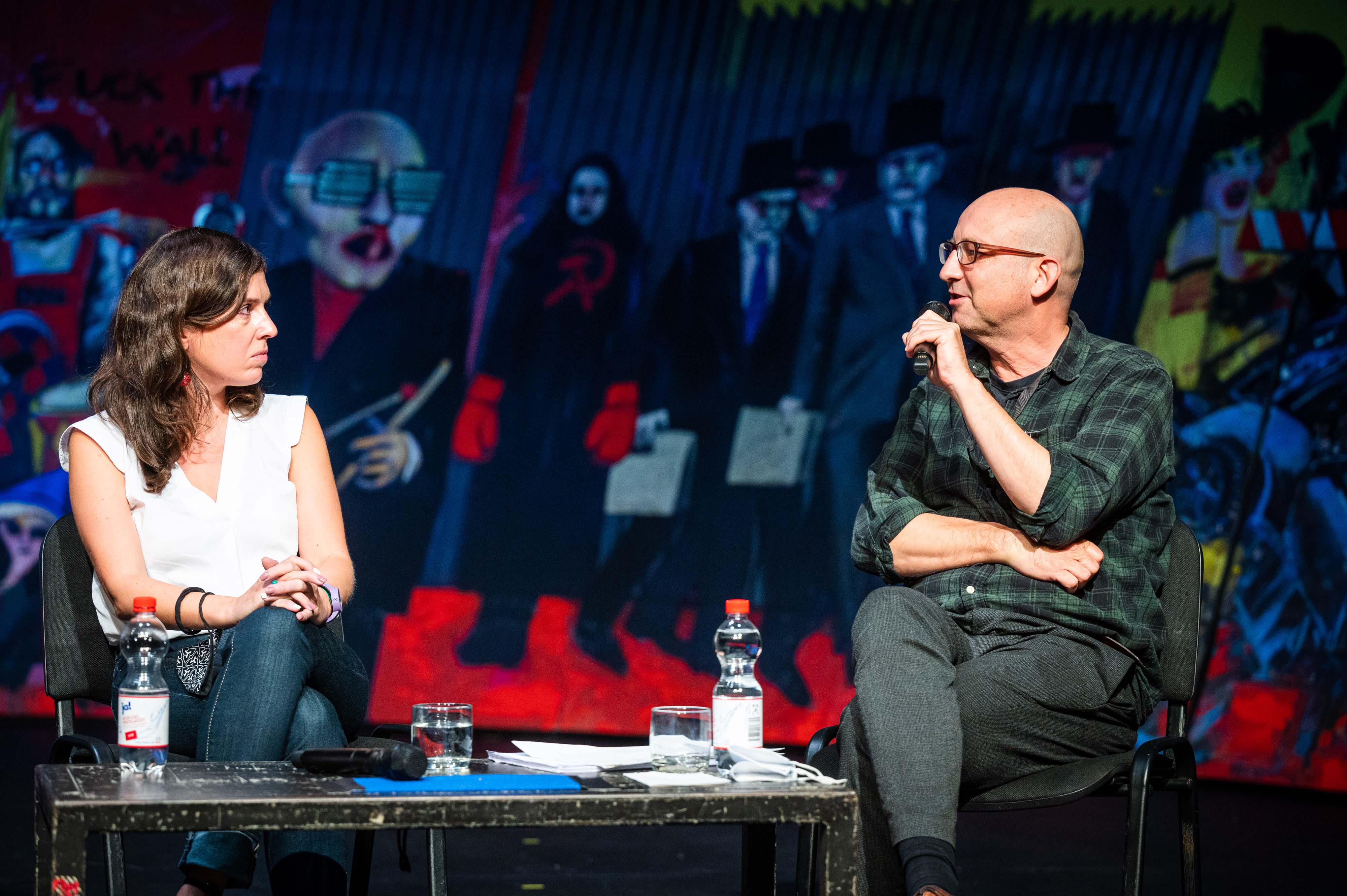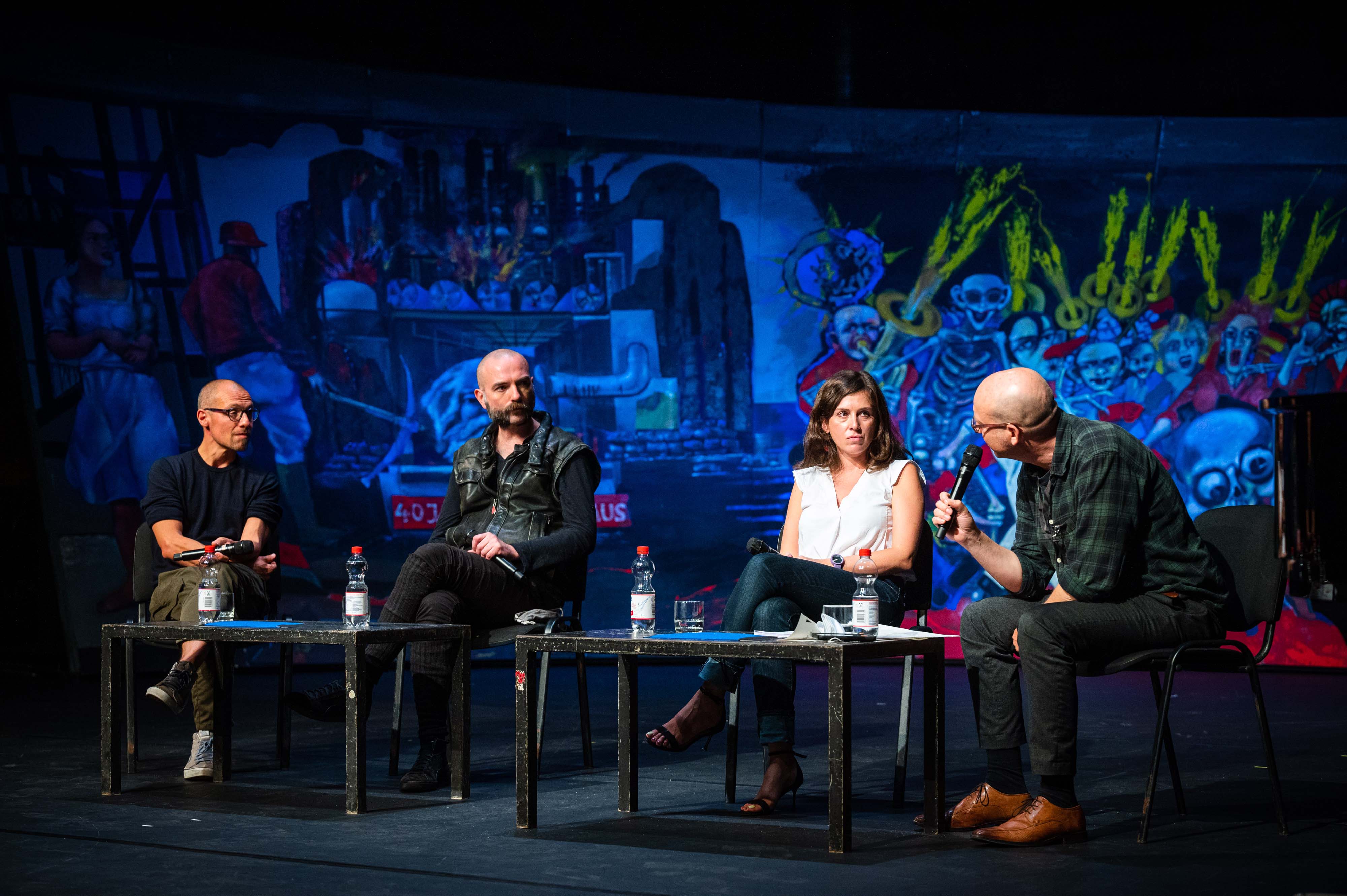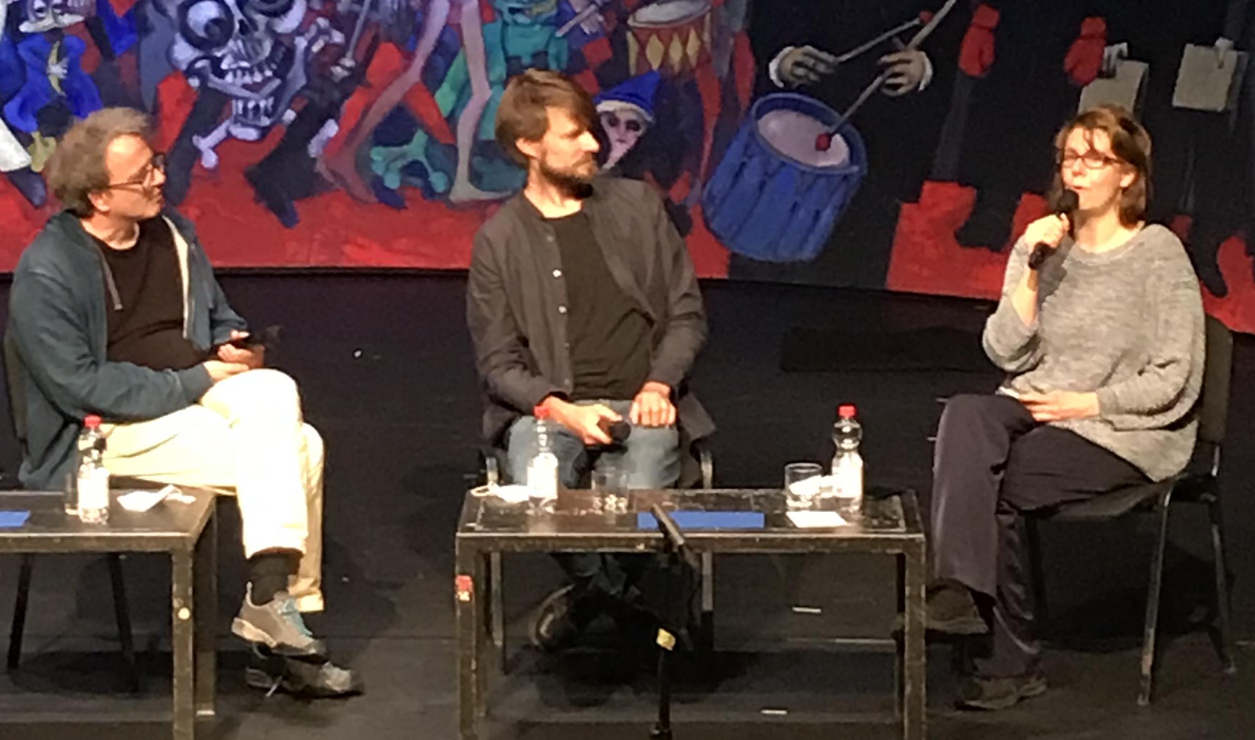 Der Übersetzer Andreas Volk vertrat Maria Wojtysko bei der Diskussion und konnte sich dabei auf ein schriftliches Interview und seine Erfahrungen bei der Übersetzung des Textes stützen. Das Verhältnis von Fiktion und Wirklichkeit, von ernsthafter Aussage und Ironie sind Themen des Stückes. Die direkt an die Schauspieler*innen gerichtete Frage hierzu wurde mit Nachdruck von Max Landgrebe beantwortet. Das vom „glücklichen Kätzchen“ und allen gesungene Schlusslied ist eine ernsthafte Botschaft: „Das Wichtigste auf der Welt / Ist, dass wir uns begegnet sind / Und ich zuhör, was der andre erzählt“.