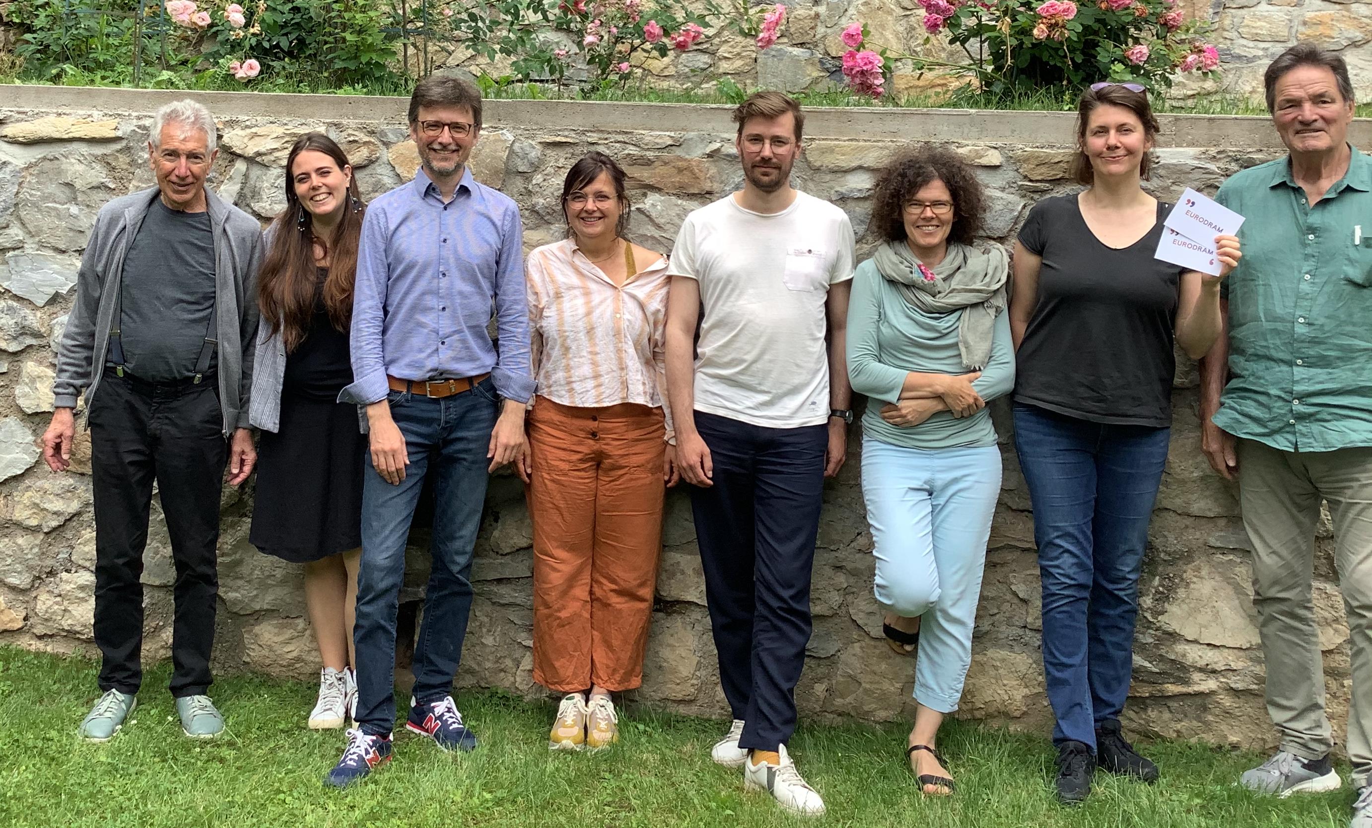 Foto © Unbekannter Gast Dramatiker/innenfestival Graz GÄSTE Bildmitte von links: Stefanie Gerhold (Übersetzerin Himmelweg, Juan Mayorga), Freek Mariën (Autor Der Mann im Tauchanzug, übersetzt von Barbara Buri), Franziska Muche (Übersetzerin Ich will die Menschen ausroden von der Erde, María Velasco Gonzales) EURODRAM-Mitglieder von links: Wolfgang Barth (Koordinator), Lorena Pircher (Dokumentatorin), Christian Mayer (Moderator Podiumsdiskussion mit den Gästen); von rechts: Heinz Schwarzinger, Charlotte Bomy (Koordinatorin)