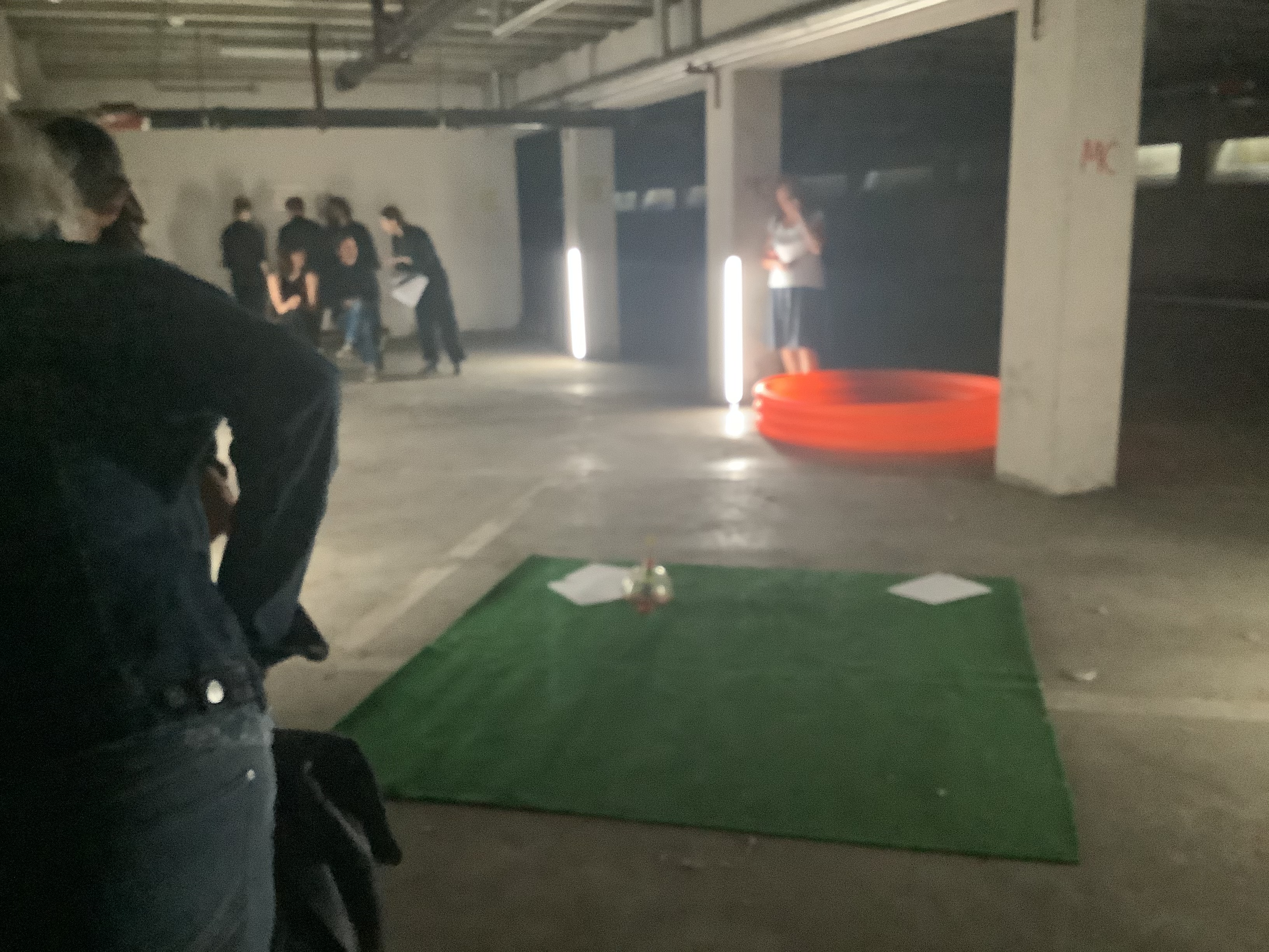 The presentation of the three plays took place during two identical „Walks“ at 7 pm and at 8 pm in the underground car park/basement of the „Vorklinik“. During such „Walks“, the audience is led to the three performance venues for one of the plays each, one after the other. The program excerpt at the end of this text provides information about the directors and performers. Despite the late hour, about 50 audience members attended each of the Walks.