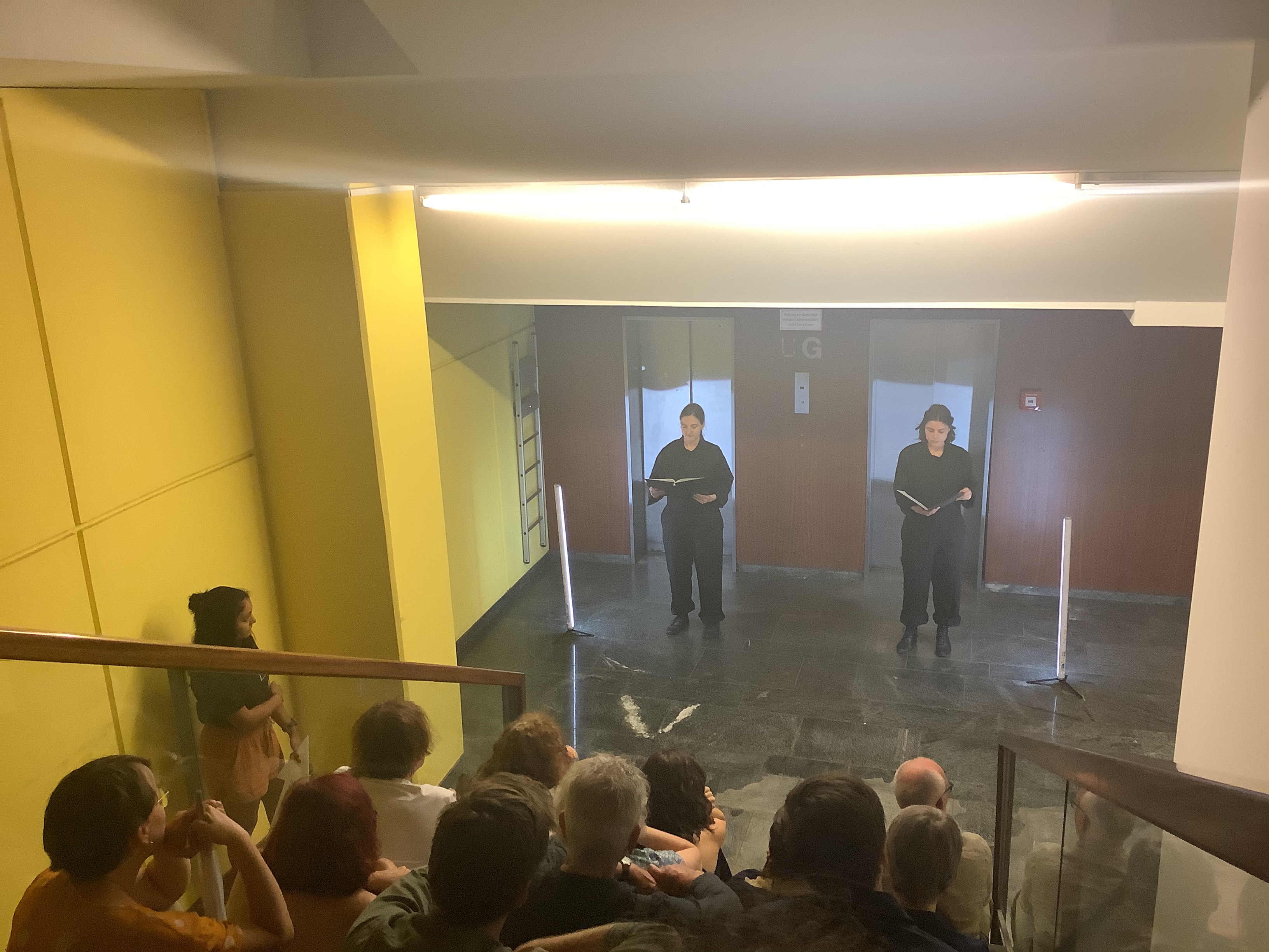 Der Abstieg in die Tiefgarage der „Vorklinik“ führte direkt zum ersten Stück des „Walks“. Die Zuschauer:innen setzten sich auf die breite Treppe, die in den zu einer Bühne umfunktionierten Gang mündete. Zwei beeindruckende junge Schauspielerinnen stellten in aneinander anknüpfenden, sich oftmals überlagernden Monologen die Gedanken der Protagonistin dar: Eine junge Frau stellt sich einer patriarchalen, konservativen Gesellschaft durch kraftvolle, eloquente, direkte Anklagen entgegen, die für viele Frauen wie Befreiungsschläge wirken. Die Diskriminierung von Frauen und die Nicht-Anerkennung ihrer Leistungen wurden in verdichteten Szenen anhand der Erfahrungen der Protagonistin deutlich: Nach einer perfekten Präsentation im Rahmen ihrer Promotion wird die Protagonisten vom Prüfungskomitee, das ausschließlich aus Männern besteht, ungerechtfertigt kritisiert, ihre Leistungen werden heruntergespielt. Sie wendet sich mit einem bewegenden Monolog an das Publikum, prangert die strukturelle Benachteiligung von Frauen an und entwickelt Reflexionen über ihr eigenes Aufwachsen und bisheriges Leben. Beim Ortswechsel während der Lesung wurden die Zuschauer:innen selbst zu dessen Bestandteil: Ihren Gang begleiteten Originalaufnahmen von Sprechchören in spanischer Sprache eines Demonstrationszuges zur Durchsetzung von Frauenrechten und gegen Vergewaltiger.