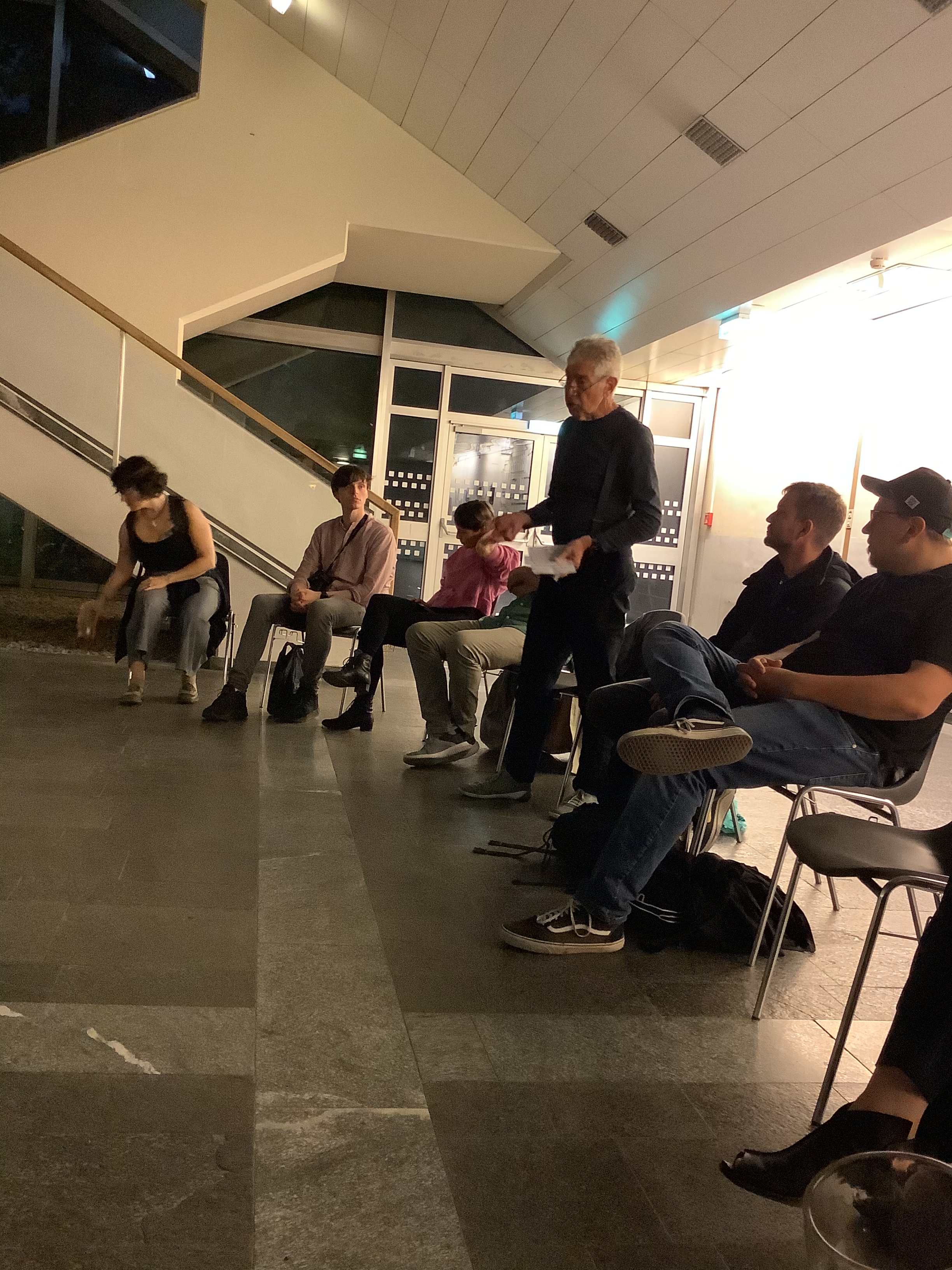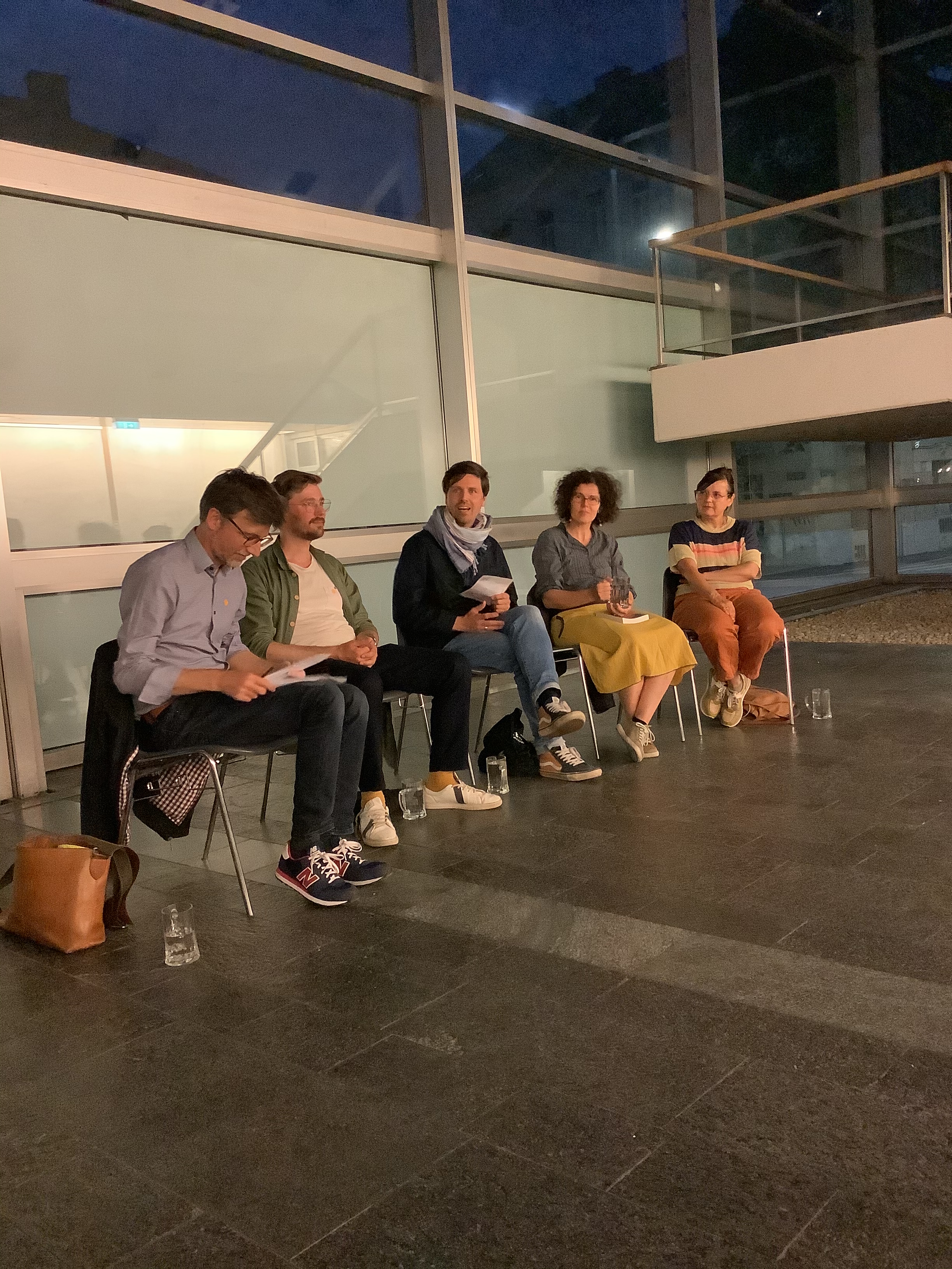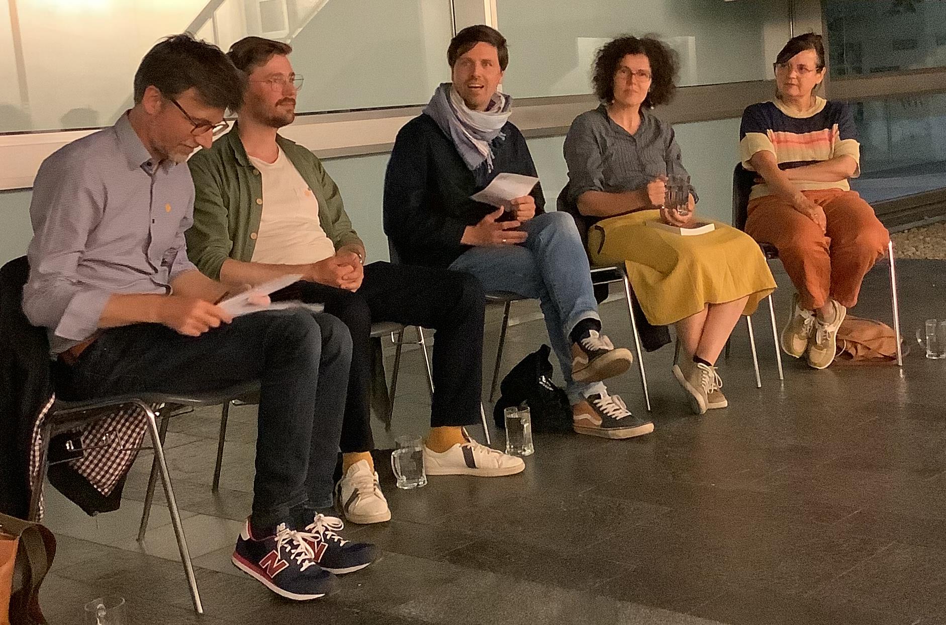 Von 21:30 bis ca. 22:30 fand vor einem kleineren (Fach-) Publikum eine Podiumsdiskussion zu den Stücken, den Darstellungen, den Übersetzungen und damit verbundenen Fragen statt. Moderiert wurde die Diskussion von Christian Mayer (für EURODRAM) und Martin Baasch (für das Dramatiker:innenfestival). Die Stücke vertraten der Autor Freek Mariën (Belgien/Flandern für DER MANN IM TAUCHANZUG) die Übersetzerin Stefanie Gerhold (Berlin, für ICH WILL DIE MENSCHEN AUSRODEN VON DIESER ERDE) und die Übersetzerin Franziska Muche (Berlin, für HIMMELWEG).