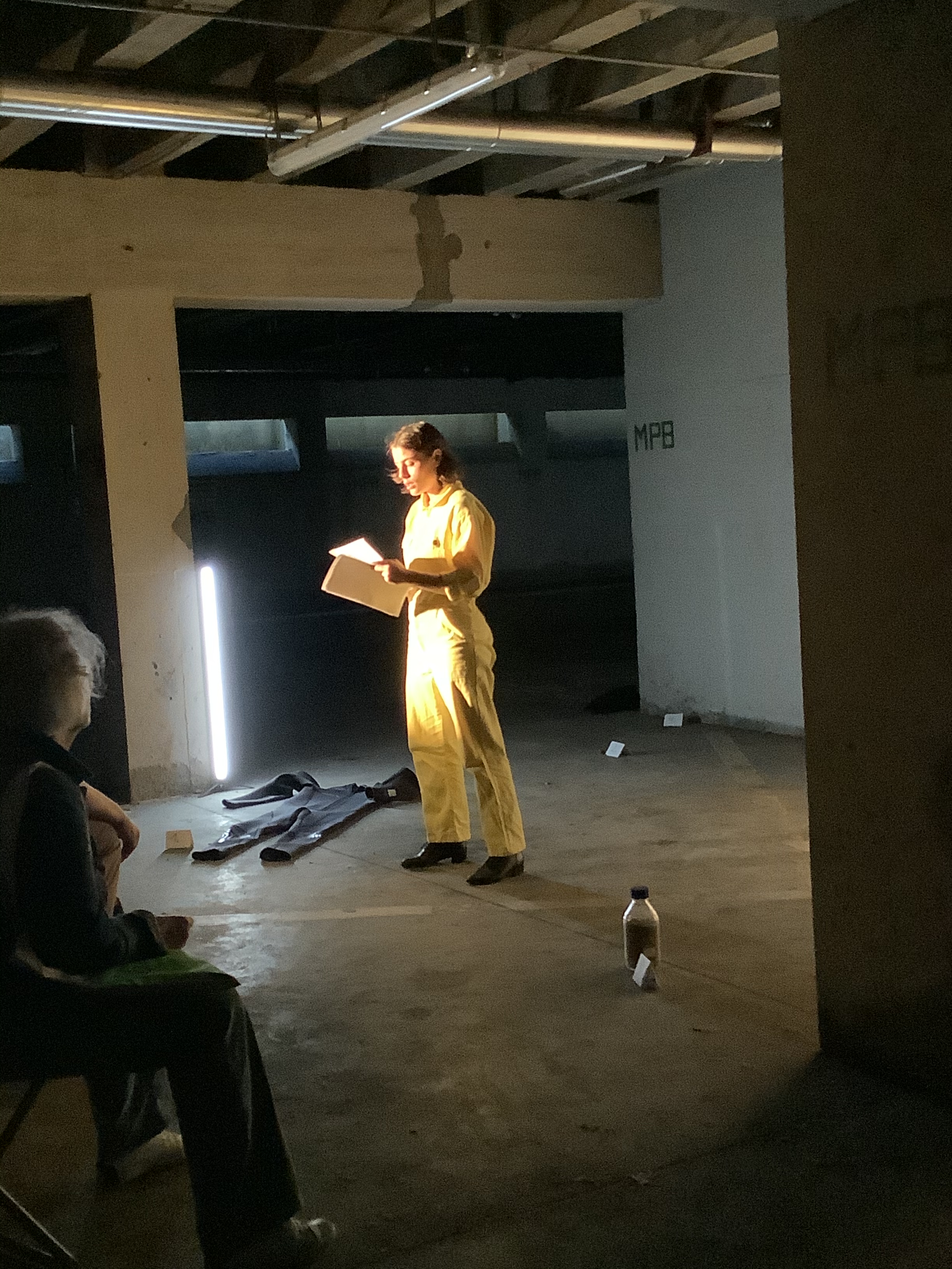Die Vorstellung erfolgte bei zwei identischen „Walks“ um 19 und um 20 Uhr in der Tiefgarage/dem Souterrain der „Vorklinik“. Bei solchen „Walks“ werden die Zuschauer*innen nacheinander zu den drei Darstellungsorten jeweils für eines der Stücke geführt. Auskunft über Regie und Darsteller*innen gibt der Programmauszug am Ende dieser Zusammenfassung. Trotz der späten Stunde nahmen an jedem der Walks etwa 50 Zuschauer*innen teil.
