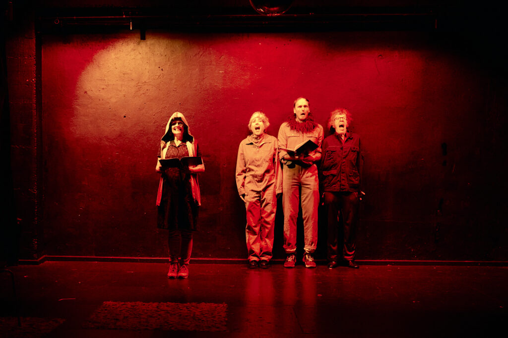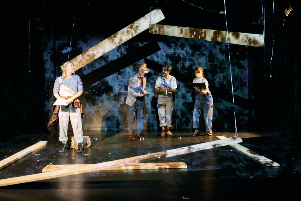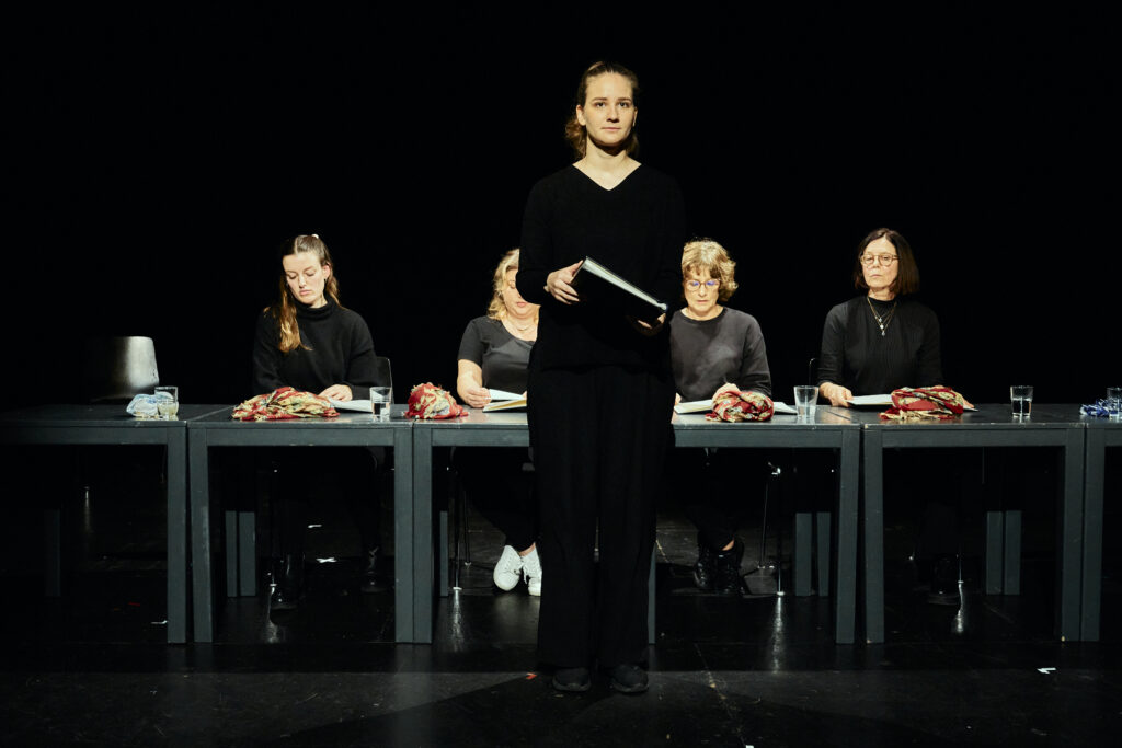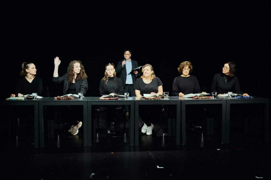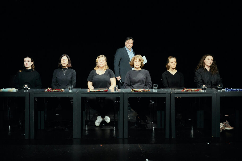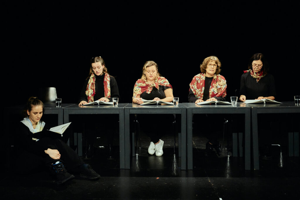 The one-hour, abridged and clearly structured presentation of this haunting and sensitive collage-like docu-theatre text was very successful. Among other things, the audience was able to participate in the female search for traces of Mantas Kvedaravicius, the documentary filmmaker, in Mariopol. The characters on stage examined the repulsive power games of a general and, on a civilian level, revealed their own biographical scenes of abuse of power in everyday theatre life (for more information on the play, see: Interview with Wolfgang Barth and Estonian director Laur Kaunissaare).