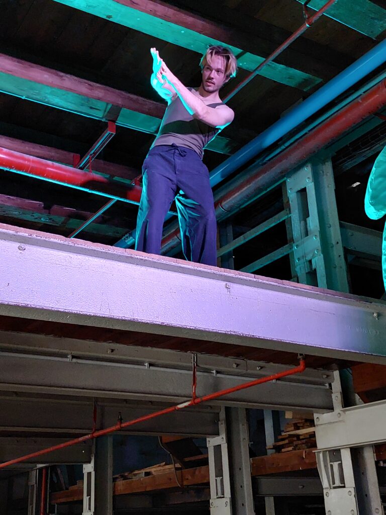 Die völlig unterschiedlichen Sichtweisen von Betroffenen und Umgebung wurde in der Inszenierung deutlich durch den Abstand zwischen Lenya Grampß (verschiedene Rollen) und Nils Hausotte (Du) einerseits und dem Publikum andererseits. Die Darstellenden spielten in deutlicher Höhe über den Zuschauer*innen, die zu ihnen aufsehen mussten.