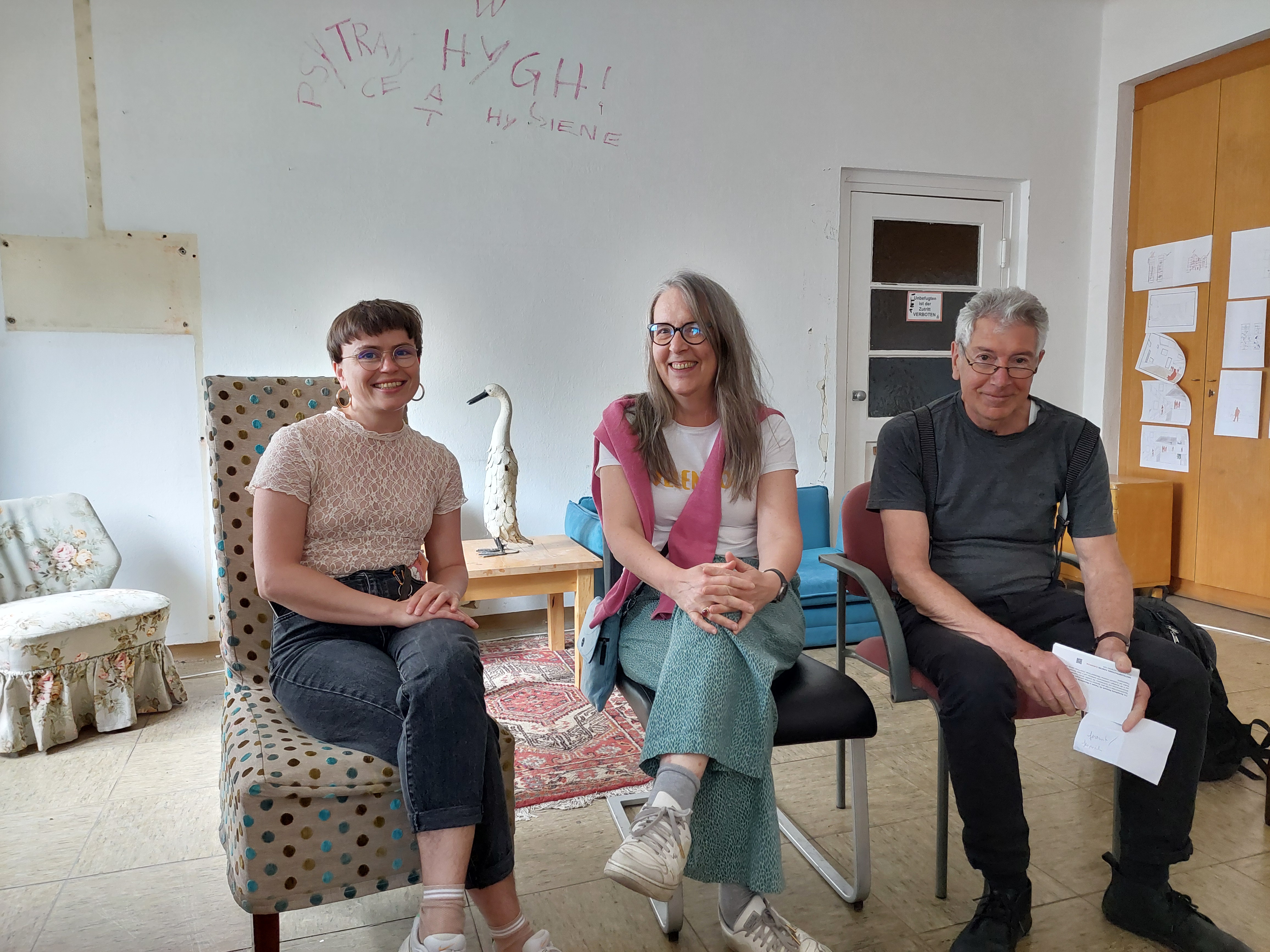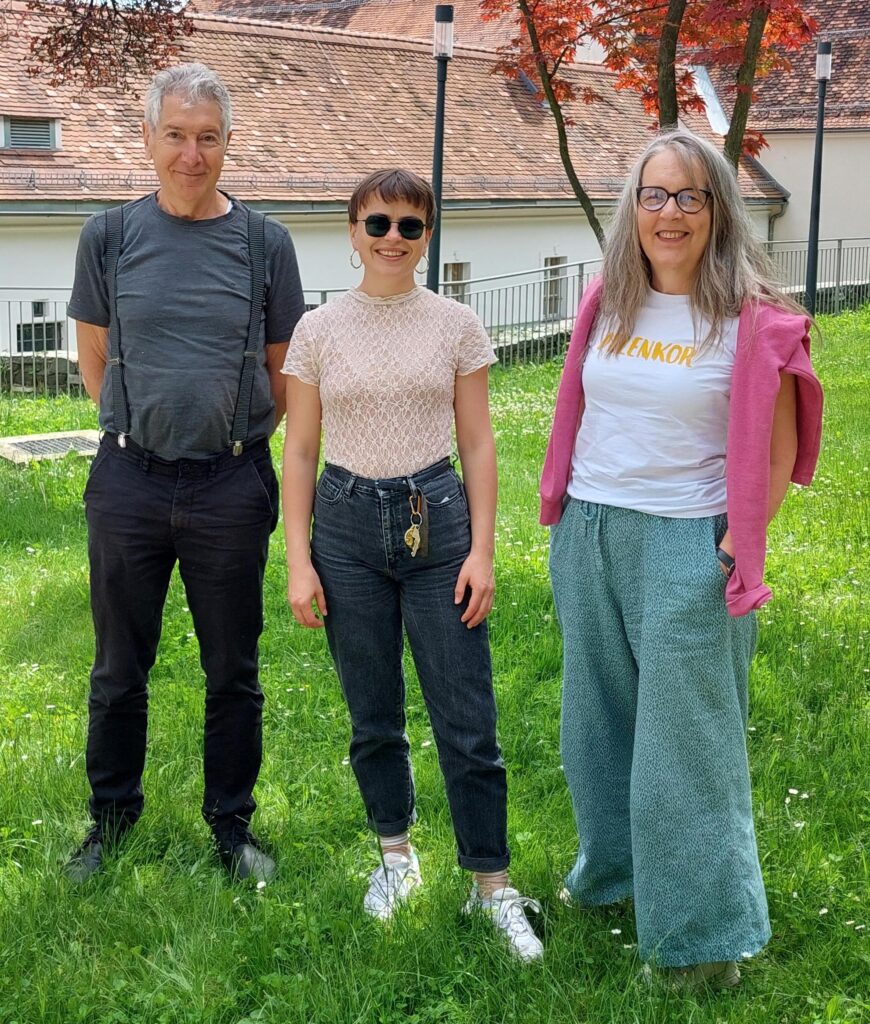 Caren Jess, Autorin (Mitte), Rike Reiniger, Autorin, Wolfgang Barth, EURODRAM, Graz, 25.05.2024; Fayer Koch konnte nicht anwesend sein. Foto © unbekannte(r) Besucher(in)